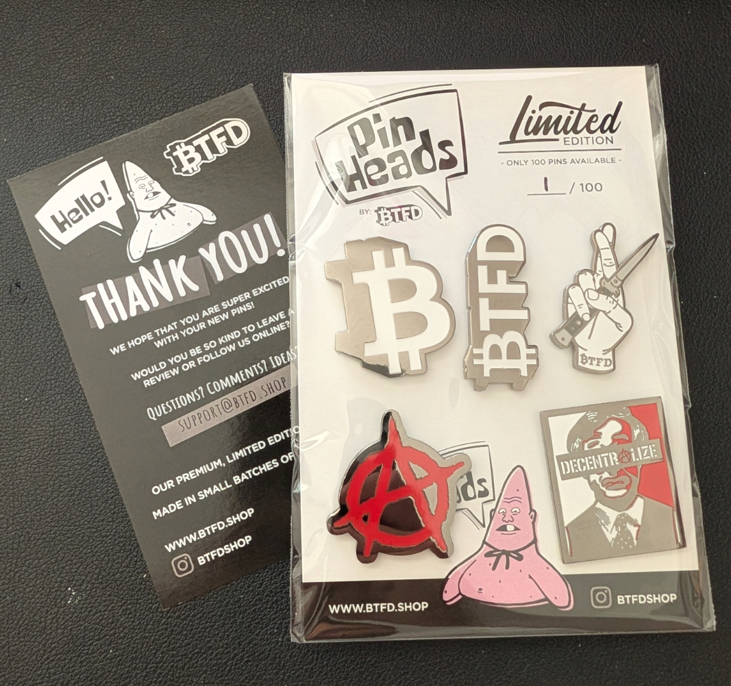Stack your drip like you stack sats. This 5-piece pin pack is for the true crypto anarchist — no rules, no banks, no weak hands.